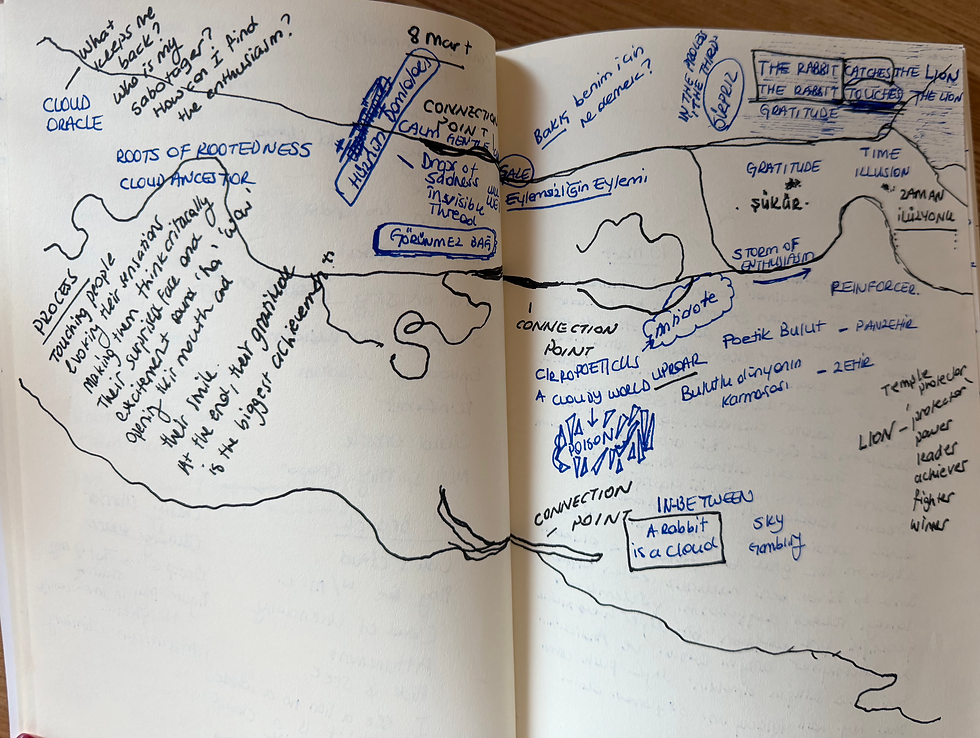 Throughout the Poetic Clouds exhibition process, particularly in moments of decentering—a concept frequently addressed in Expressive Arts—the artistic practice itself began to unfold as a creative process operating within poiesis.