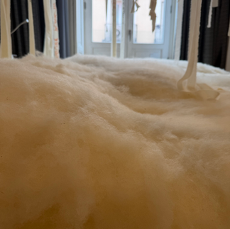 We placed raw sheep wool—brought from Switzerland—onto the bed. Its scent, texture, and presence became almost the flesh of the work.